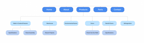 The site map for Louisville Cooler's website reflects a well-organized structure designed to enhance user experience and streamline navigation. Beginning with the primary categories of "Home," "About," "Products," "Parts," and "Contact," users are provided with clear pathways to explore the company's offerings. Within the "Products" section, subcategories such as "Walk-In Coolers/Freezers," "Warehouse," "Environmental Rooms," "Doors," and "Refrigeration" further refine the browsing experience, allowing users to easily locate specific information.